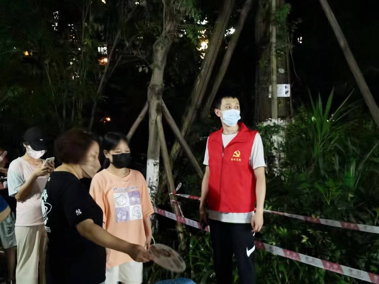 由于封控小區(qū)大多數(shù)居民選擇網(wǎng)上下單購買物資,大量物資堆放在小區(qū)大門,為確保大家生活物資供應(yīng)正常,黃黌贇化身“配送員”,第一時間攬下了這項體力活。白天閑暇時在烈日暴曬下推著大型購物車穿梭在小區(qū)內(nèi),為居民運送物資,保障居民正常生活,與其他志愿者一道,共同守護者小區(qū)居民生活物資保障中的“最后100米”。傍晚,黃黌贇化身“引導(dǎo)員”,協(xié)助搭建遮陽傘,搬運防疫物資,布置核酸檢測場地,維持現(xiàn)場秩序,引導(dǎo)居民進行核酸檢測,提供暖心服務(wù),助力核酸采集工作高效開展。往往一天的工作還未結(jié)束,他的手掌被泡得發(fā)白發(fā)皺,汗水早已經(jīng)浸透全身。
