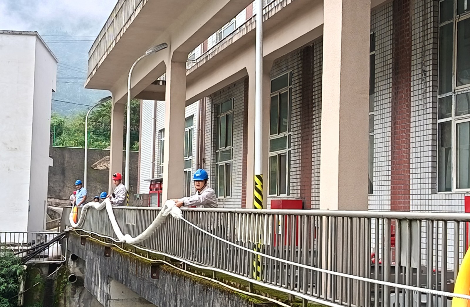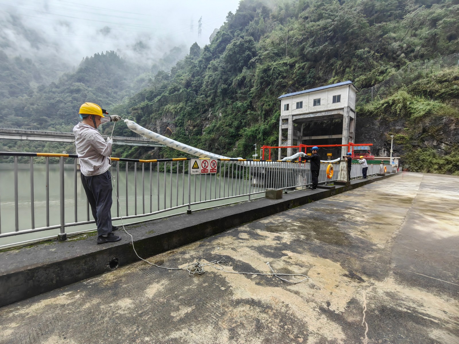 本次演練背景設(shè)定為電站大壩2#泄洪閘左側(cè)齒輪箱突發(fā)漏油,約50升齒輪油濺落至庫(kù)區(qū)水面并擴(kuò)散,值班人員發(fā)現(xiàn)險(xiǎn)情后立即啟動(dòng)應(yīng)急響應(yīng)。中控室迅速協(xié)調(diào)上下游鍋浪蹺、匯溪電廠調(diào)整出力流量并協(xié)助布設(shè)攔油設(shè)施;運(yùn)行組與應(yīng)急搶險(xiǎn)組攜帶吸油氈、攔油索等器材趕赴現(xiàn)場(chǎng),對(duì)漏油點(diǎn)進(jìn)行封堵,同時(shí)在閘門(mén)前和水面關(guān)鍵區(qū)域鋪設(shè)攔油繩,防止污染擴(kuò)散;后勤保障組全程待命,確保物資供應(yīng)和人員安全。經(jīng)過(guò)30分鐘緊張有序的處置,油污被徹底清理,庫(kù)區(qū)水質(zhì)未受影響,演練圓滿完成。